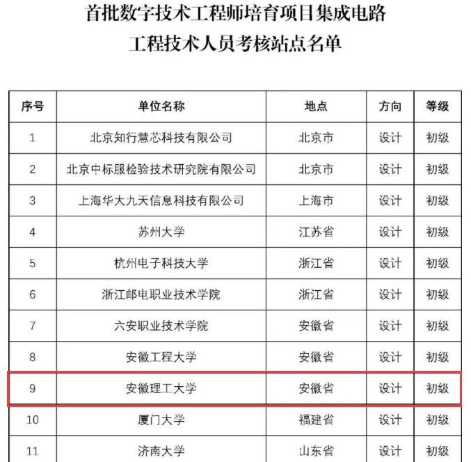 1月29日,工业和信息化部电子工业技术标准化研究院公布了25家全国首批数字技术工程师培育项目-集成电路工程技术人员考核站点,我校成为安徽省同时入选的3个考核站点之一。