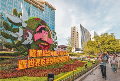 纪念中国人民抗日战争暨世界反法西斯战争胜利80周年主题花坛亮相北京长安街沿线